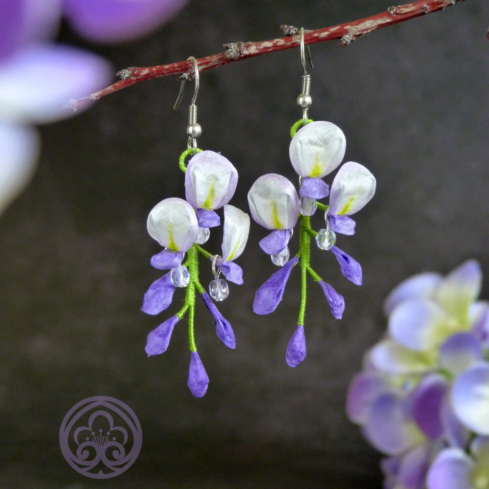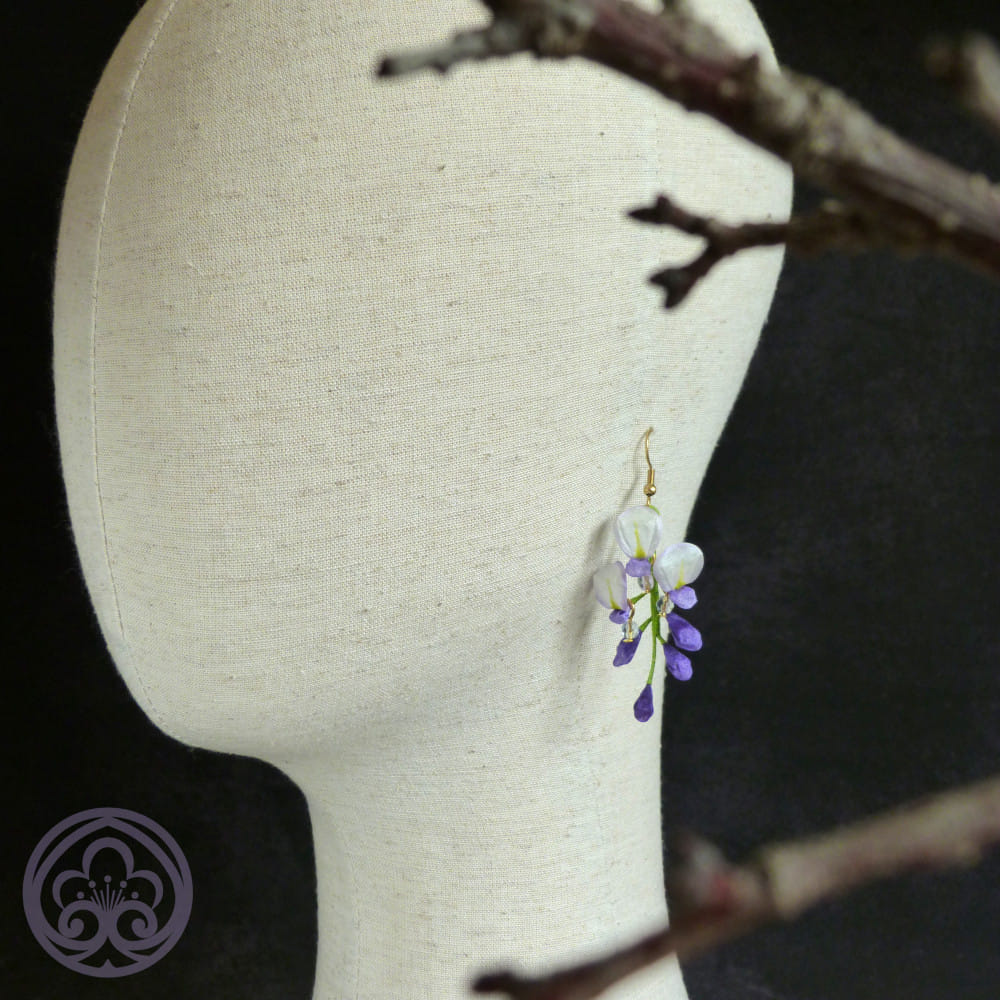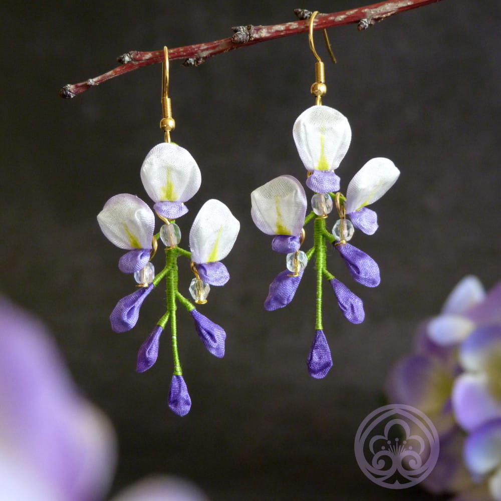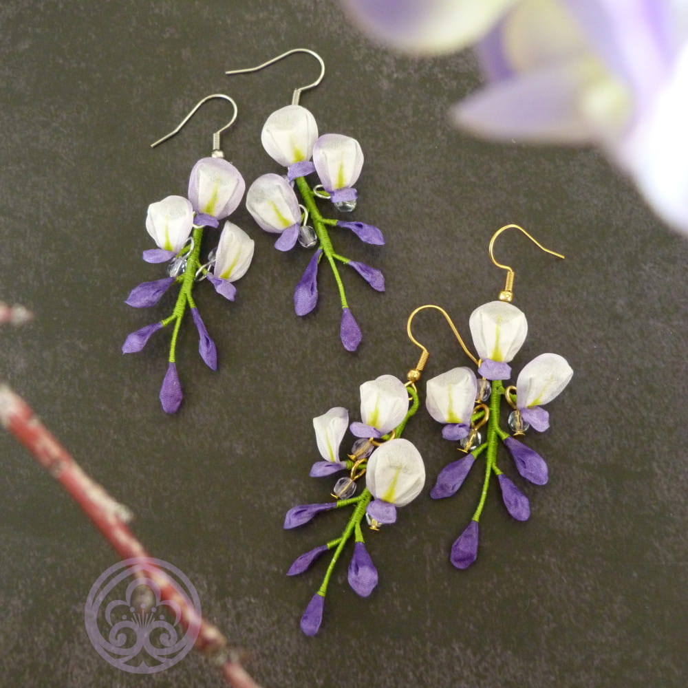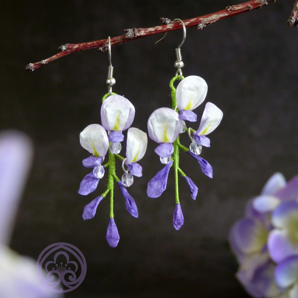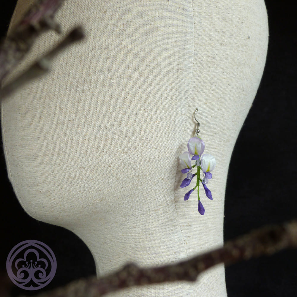 Un piccolo grappolo di glicine in seta habutae, decorato da piccoli cristalli lilla e appeso a delle monachelle in acciaio inossidabile. La stoffa è stata tinta e modellata a mano, petalo per petalo.
